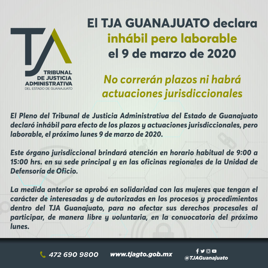 El TJA GUANAJUATO declara inhábil pero laborable el 9 de marzo de 2020 marzo 5, 2020 Noticias Share This Twitter Facebook LinkedIn Correo electrónico Entradas relacionadas Magistrada María Raquel Barajas Monjarás, es designada Presidenta del TJA Guanajuato para el período 2025-2026. Silao de la Victoria, Gto., a 08 de enero de 2025 .- “La confianza se… TJA Guanajuato: Un compromiso inquebrantable con la justicia administrativa en 2024. Silao de la Victoria. 16 de diciembre de 2024.- Con la integración e inicio de… Innova TJA Guanajuato en mecanismos de impartición de justicia Administrativa Cumple TJA Guanajuato 37 años de impartir Justicia Silao de la Victoria, Guanajuato, a 11…